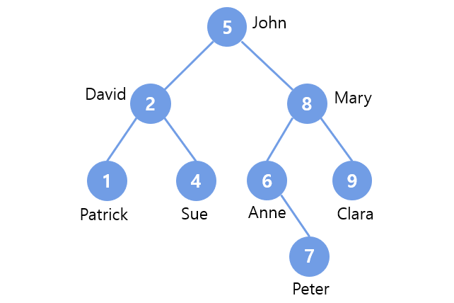 ๋ฐ์ดํฐ ํํ - ๊ฐ ๋ ธ๋๋ (key, value)์ ์์ผ๋ก ํํํ๋ค. ํค๋ฅผ ์ด์ฉํด์ ๊ฒ์๊ฐ๋ฅ, ๋ณด๋ค ๋ณต์กํ ๋ฐ์ดํฐ ๋ ์ฝ๋๋ก ํ์ฅ ๊ฐ๋ฅํ๋ค. ์ซ์๊ฐ key, ์ด๋ฆ์ด value