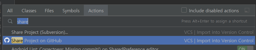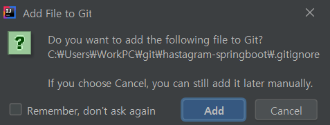 ํ๋ก์ ํธ์ ์ฒซ ๋ฒ์งธ ์ปค๋ฐ์ ์ํ ํ์ ์ฐฝ์ด ๋ฌ๋ค. .idea ๋๋ ํ ๋ฆฌ๋ ์ธํ ๋ฆฌ์ ์ด์์ ํ๋ก์ ํธ ์คํ์ ์๋์ผ๋ก ์์ฑ๋๋ ํ์ผ๋ค์ด๊ธฐ ๋๋ฌธ์ ๊นํ๋ธ์ ์ฌ๋ฆฌ๊ธฐ์๋ ๋ถํ์ํ๋๊น ์ปค๋ฐํ์ง ์๋๋ค. Add๋ฅผ ๋๋ฅด๋ฉด ๊น ์ปค๋ฐ๊ณผ ๊นํ๋ธ ํธ์๊ฐ ์งํ๋๋ค.