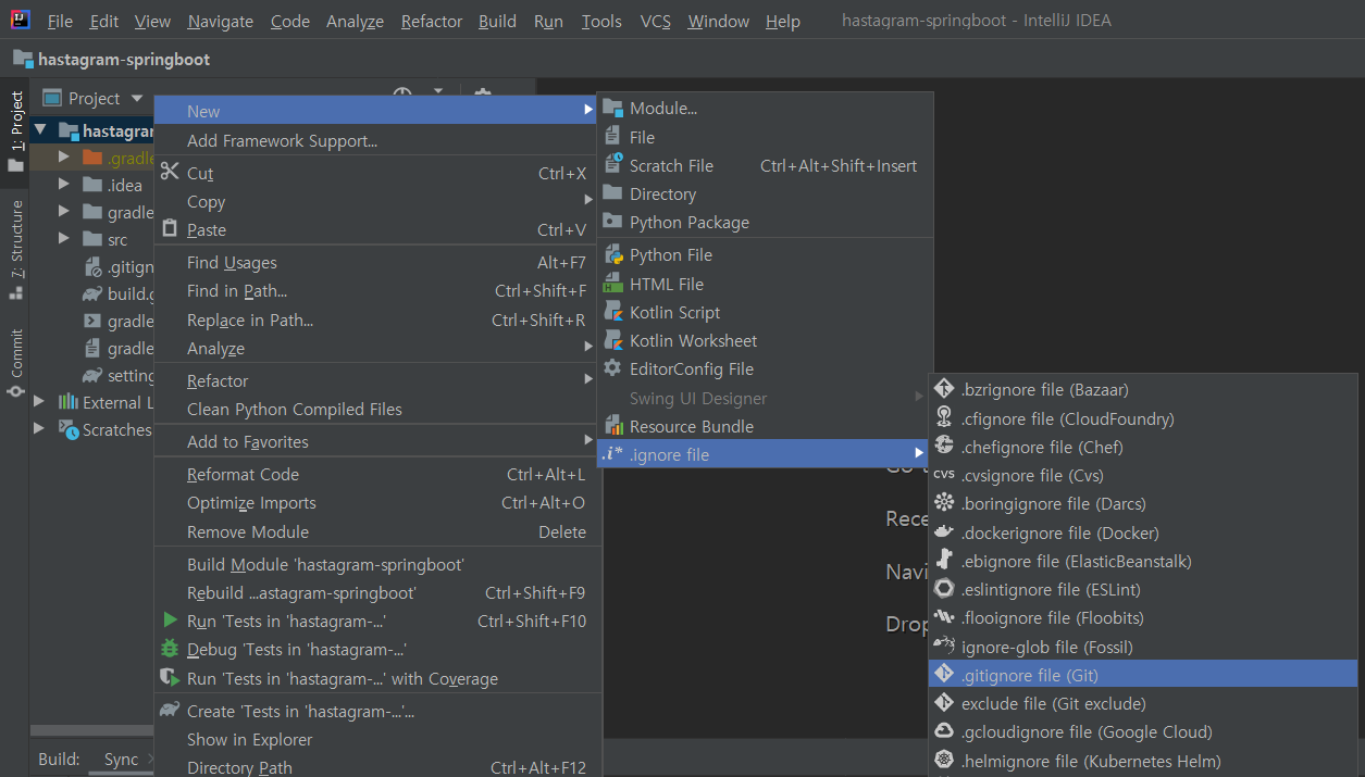 ์ด๊ทธ๋ ธ์ด ํ์ผ์ ์์ฑํ๊ธฐ ์ํด ํ๋ก์ ํธ ์ด๋ฆ์ ์ ํํ ๋ค ๋ง์ฐ์ค ์ค๋ฅธ์ชฝ ๋ฒํผ์ ๋๋ฅด๊ฑฐ๋ ๋จ์ถํค [Alt + Insert]๋ฅผ ๋๋ฌ ์์ฑ ๋ชฉ๋ก์ ์ฐ๋ค.
