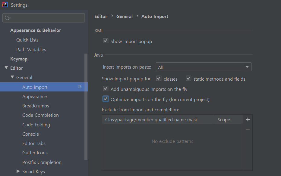 File - Setting - Editor - General - Auto Import ์์ ๋ ๊ฐ ์ฒดํฌํด์ค๋ค! (Add~~๋ Optimize~~ ๋๊ฐ)