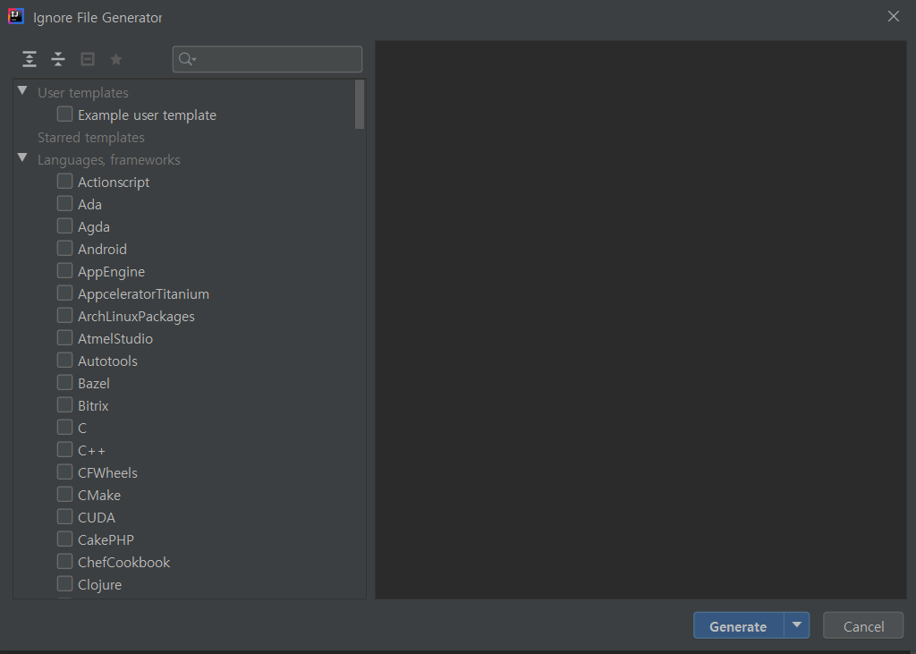 ๋ง๋ค์ด๋ ํ ํ๋ฆฟ์ด ์์ผ๋๊น ๋ฐ๋ก [Generate]๋ก ์ด๊ทธ๋ ธ์ด ํ์ผ์ ์์ฑํ๋ค. ์์ฑ๋ ํ์ผ์ ๊น ์ฒดํฌ ๋์์์ ์ ์ธํ๊ณ ์ถ์ ์ด๋ฆ์ ์์ฑํ๋ฉด ๋๋ค. ์ธํ ๋ฆฌ์ ์ด์์ ์๋์ผ๋ก ์์ฑ๋๋ ํ์ผ์ ๋ชจ๋ ์ด๊ทธ๋ ธ์ด ์ฒ๋ฆฌํ๋ค.