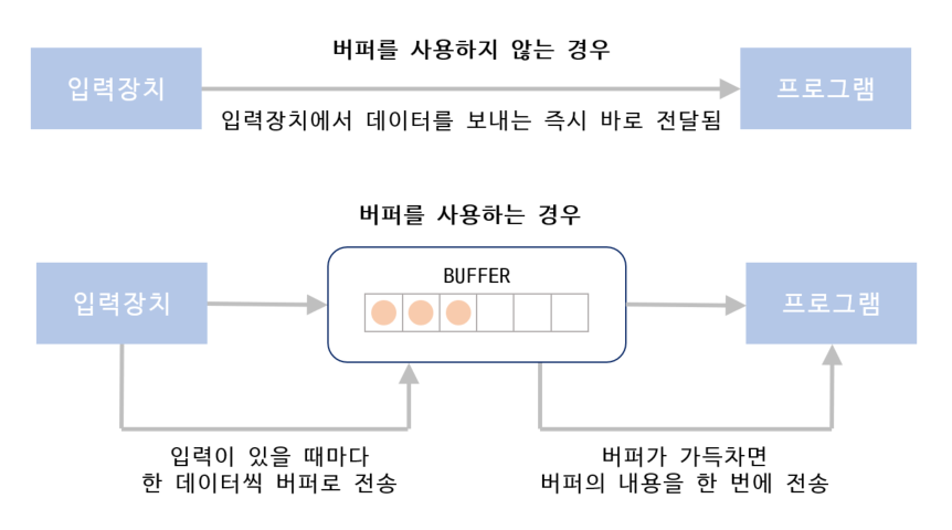 μλ₯Ό λ€μ΄ μ¬μ©μλ 1μ΄μ 100κ°μ λ°μ΄ν°, νλ‘κ·Έλ¨μ 1μ΄μ 5κ°μ λ°μ΄ν°λ₯Ό μ²λ¦¬ν μ μλ€κ³ κ°μ μ ν΄λ³΄μ. νλ‘κ·Έλ¨ μ²λ¦¬λ₯Ό μ§ννλ λμ μ λ ₯μ₯μΉλ₯Ό ν΅ν΄ λ€μ΄μ€λ λ°μ΄ν°λ λκΈ°λ₯Ό ν΄μΌνλ μν©μ΄ λλ€. μ΄λ¬ν μν©μ λ°©μ§νκΈ° μν΄ μ λ ₯λ°μ λ°μ΄ν°λ₯Ό λ²νΌλΌλ μμ곡κ°μ μ μ₯ν΄λκ³ νλ‘κ·Έλ¨μμ μ²λ¦¬ν μ μλ μν©μ΄λκ±°λ λ²νΌκ° κ½μ°¨κ² λλ©΄ λ²νΌμ μ μ₯λ λ°μ΄ν°λ₯Ό ν λ²μ μ μ‘μ νλ€.