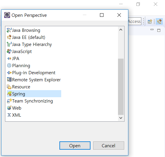 3. ์ค์น๊ฐ ์๋ฃ๋๋ฉด ์ดํด๋ฆฝ์ค๋ฅผ ์ฌ์์ํ๊ณ Perspectice์์ Spring ์ ํ